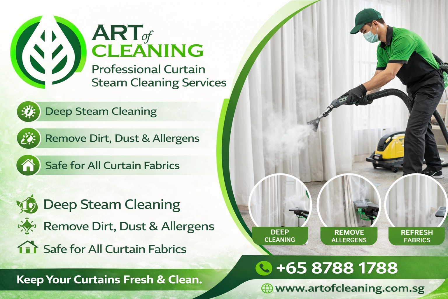 Refresh your curtains without taking them down with Art of Cleaning’s professional curtain steam cleaning services.