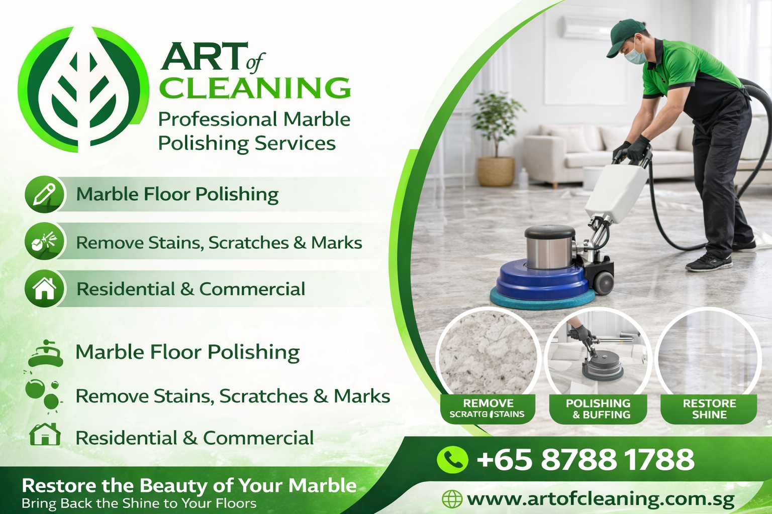 Restore the natural shine and elegance of your marble surfaces with Art of Cleaning’s professional marble polishing services.