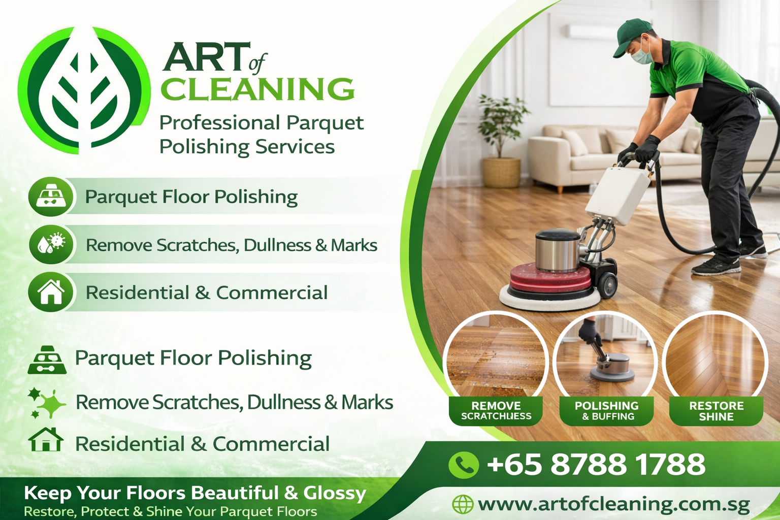 Restore the beauty and shine of your wooden floors with Art of Cleaning’s professional parquet polishing services.