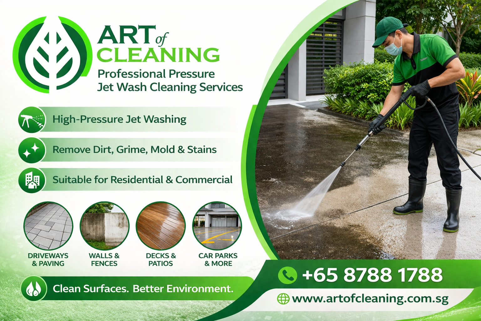 Restore the clean look of your outdoor surfaces with Art of Cleaning’s professional pressure jet wash services.